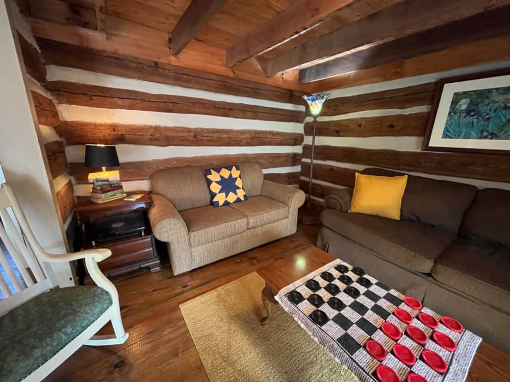 Experience the mountains of North Georgia at this full-time homestead! One of four historic cabins on our property, located just 10 minutes from Fort Mountain State Park, 25 minutes from Ellijay, and 45 minutes from Blue Ridge. Come enjoy hiking, mountain biking, local history, or simply relax by the creek that borders the property. The hosts and their dogs are happy to let you enjoy your stay in peace, or to visit and tell you more about the area! The cabin is set on a 8 acre property, along with three other rental cabins, all original log cabins from the late 18th, early 19th century. The hosts live on the property, along with their friendly dogs. You’ll likely see them working outside, whether it be in the garden or with the chickens. On the main floor of this two story “dogtrot” cabin you’ll find a cozy living room, a full kitchen, and a full bathroom. The living room has a smart TV, books, and games. The kitchen is stocked with necessities for cooking, as well as a dining table for enjoying your meals! In the full bathroom you’ll find a washer and dryer that are available for guest use. Upstairs are two bedrooms, one with a full sized bed, the other with a queen sized bed. There is a half bathroom located in between the two bedrooms. There is a front deck and a back screened-in porch to this cabin! The front deck has a swing where you can enjoy looking out onto the rest of the property. The back porch allows a secluded space for more privacy. Sammy the cat may visit you while you’re outside. This cabin has its own backyard space, and in the winter you can peek through the trees and see Fort Mountain! Guests are welcome to explore all 8 acres! There is a stream that borders an edge of the property and a parcel of woods that is great for walking. If you prefer to hang close to the cabin, there is a fire pit for roasting marshmallows. At least one of the four hosts will likely be on the property at any given time. Feel free to reach out through the app if you need anything, or flag us down if you see us outside! We are located an hour and a half north of Atlanta and just about an hour southeast of Chattanooga. Ellijay, the mountain biking capital of Georgia, is less than a half hour’s drive, and we are just two miles from the Pinhoti Trail. In addition to hiking and mountain biking there are historical sites, breweries, small mountain towns, and endless taquerias within a half an hour in any direction. All four cabins are located along a gravel driveway and are easily accessible by any vehicle. Look for the door color to indicate which cabin you’ll be staying in! One or two cars can easily be parked in front of each unit.